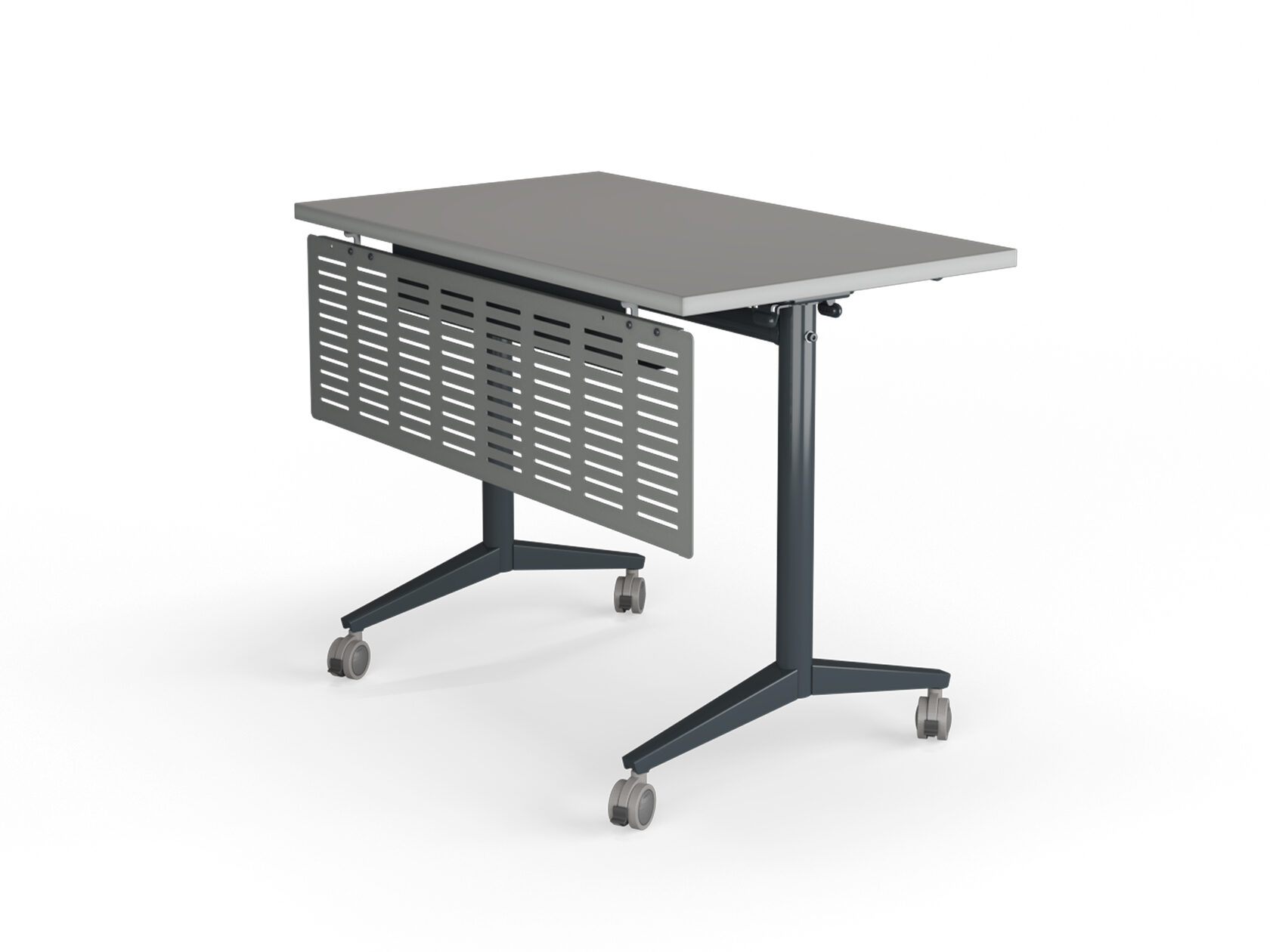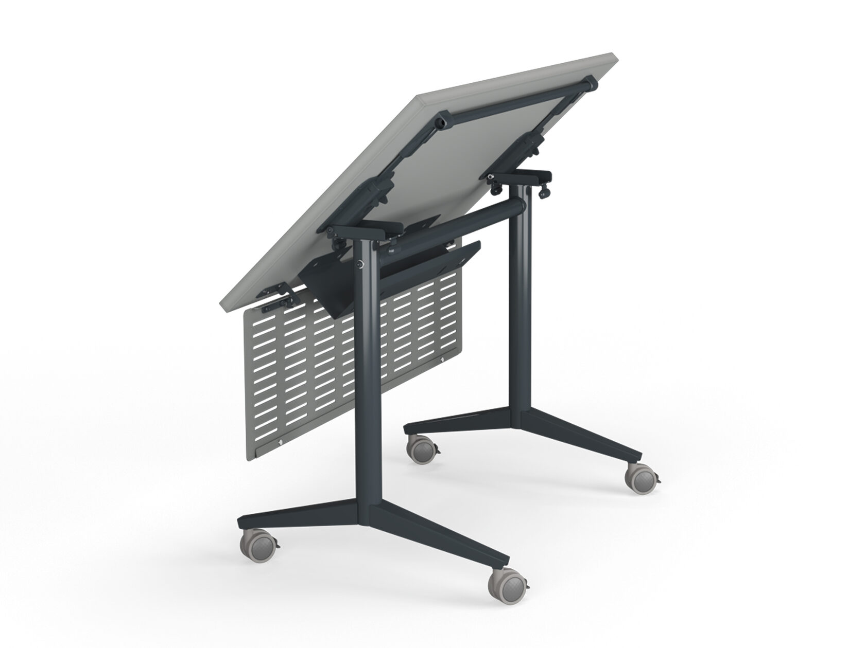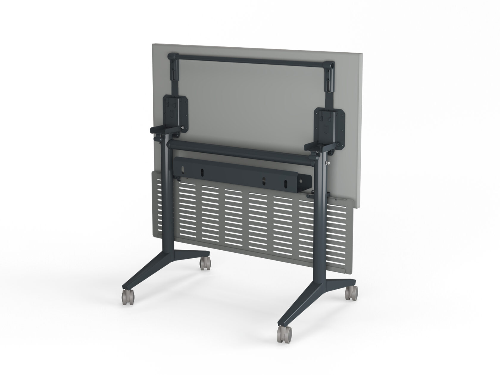 Каркас возможно комплектовать специальным креплением для подстольного экрана. При складывании-раскладывании стола механизм обеспечивает перпендикулярное полу положение экрана. В разложенном рабочем положении экран жестко фиксируется и не раскачивается. (опция)